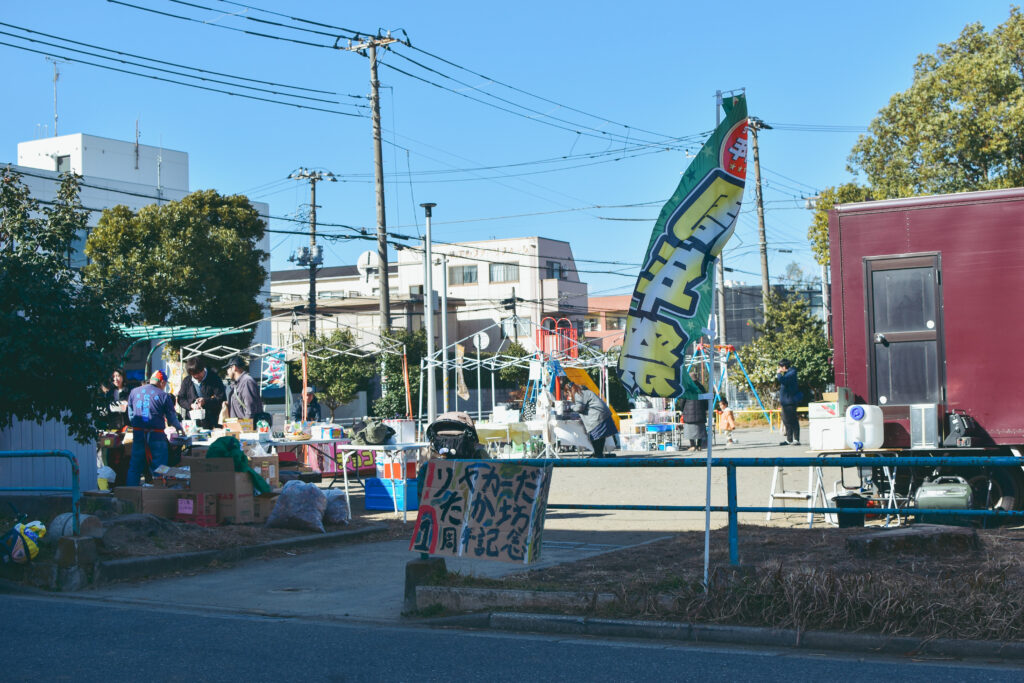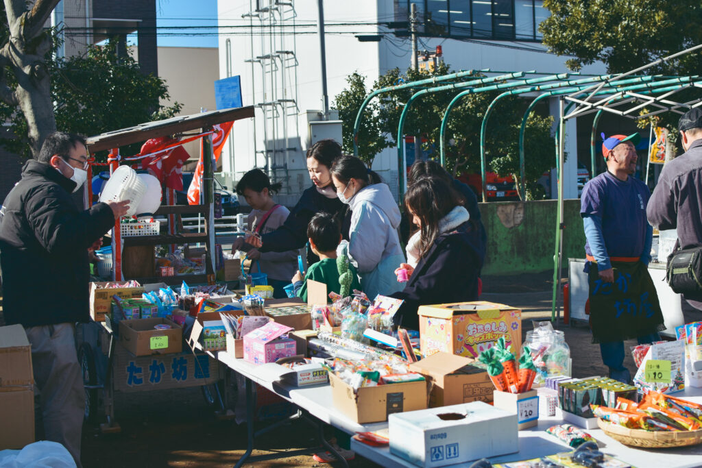 風の影響で看板や旗が大きくはためき、備品が飛び、テントの屋根も外さないといけなくなるなど、対応に追われながらも、駄菓子を求める子どもたちに笑顔で対応するたか坊屋さん。出店者さん同士助け合いながらの開催で、あたたかい空気が流れていました。